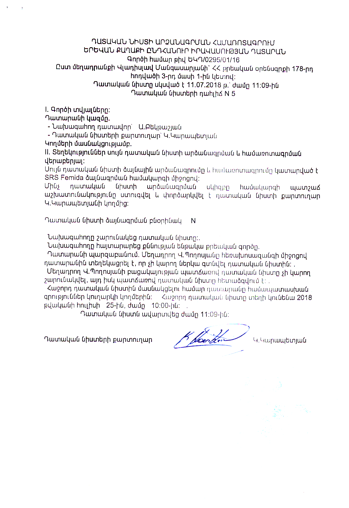 Նիստը կայացել է նշված օրն ու ժամին և հետաձգվել մեղադրողի բացակայության պատճառով։ Կից ներկայացնում ենք նաև 11.07.2018թ կայացած նիստի արձանագրության քաղվածքը։ Առկա է նաև ձայնագրությունը: Ըստ պահանջի՝ կարող ենք ներկայացնել նաև ձայնագրությունը: