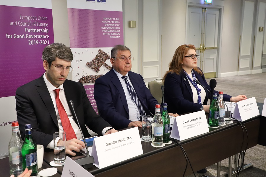 Այսօր՝ ապրիլի 21-ին, Բարձրագույն դատական խորհրդի նախագահի պաշտոնակատար Գ. Ջհանգիրյանը, Խորհրդի մի շարք անդամներ, ինչպես նաև ՀՀ Արդարադատության փոխնախարարը, Վճռաբեկ դատարանի նախագահը, դատավորներ մասնակցել են Եվրոպայի խորհրդի կողմից կազմակերպված քննարկմանը, որը վերաբերում էր 2021 թվականի օգոստոսի 30-ի «Գործերի քննության միջին տևողության ուղենիշային ժամկետները՝ ըստ գործերի առանձին տեսակների և բարդության սահմանելու մասին» թիվ ԲԴԽ-65-Ո-165 որոշմանը: